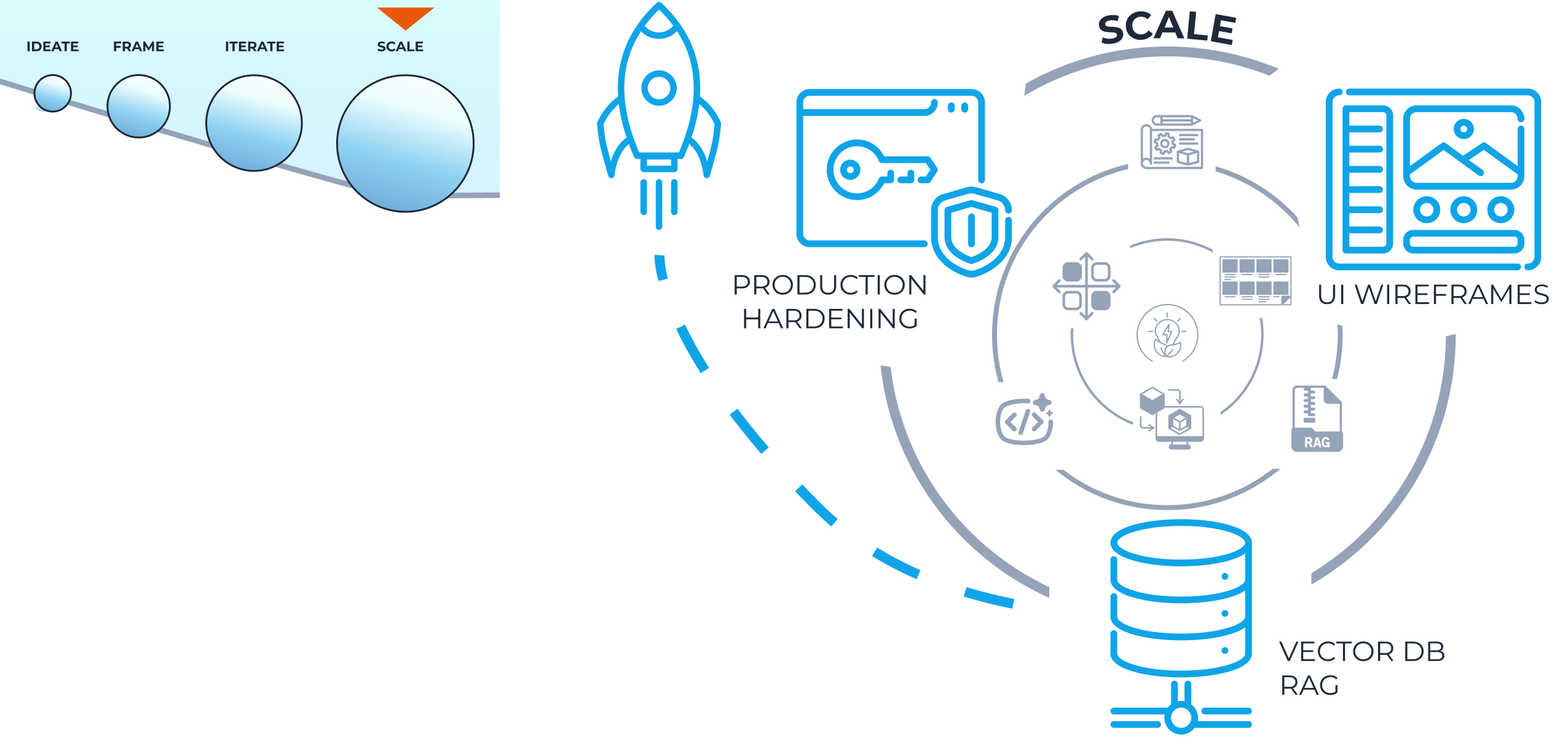 When validation proves your AI application delivers value, scale to production: refine the AI agents through RITE testing, build production-grade infrastructure, and design the polished UI. Enhance to a market-ready product in weeks, not months.